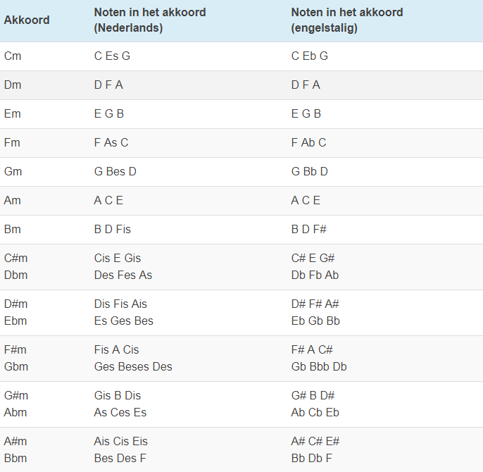 - De grondtoon gevolgd door de letters “min”, bijvoorbeeld: Cmin