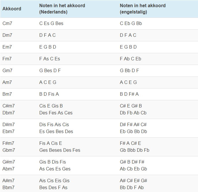 Voor de volledigheid heb ik in de onderstaande tabellen voor de grondtonen met een zwarte toets-noot ook de akkoorden van de enharmonisch gelijke grondtoon opgenomen (ik heb dus bijvoorbeeld niet alleen maar het Es mineur septiem akkoord genoteerd, maar ook het Dis mineur septiem akkoord).