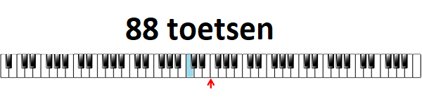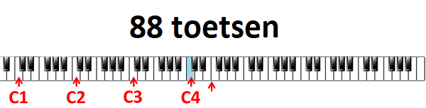 Op een piano met 88 toetsen is dit de C net links van het exacte midden van het klavier.