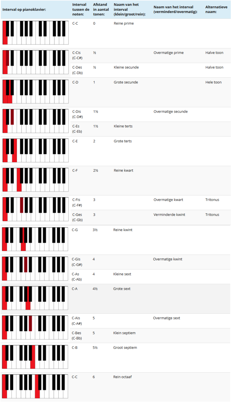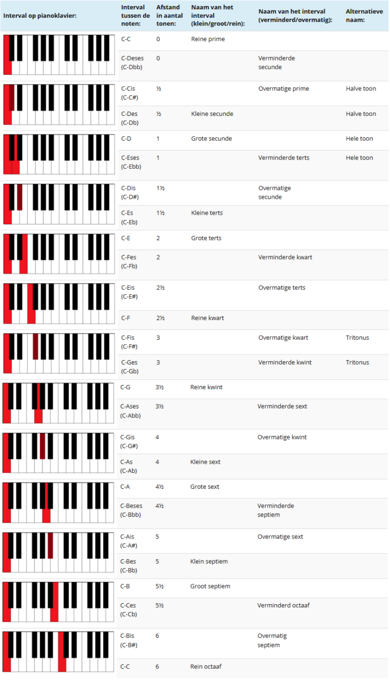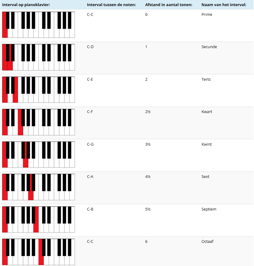 Opmerking: In eerste instantie lijkt het vreemd om in het geval van de “prime” te spreken van een interval, het gaat immers om de afstand van een noot tot zichzelf. Je kunt dit echter gewoon een interval van 0 (hele) tonen noemen.