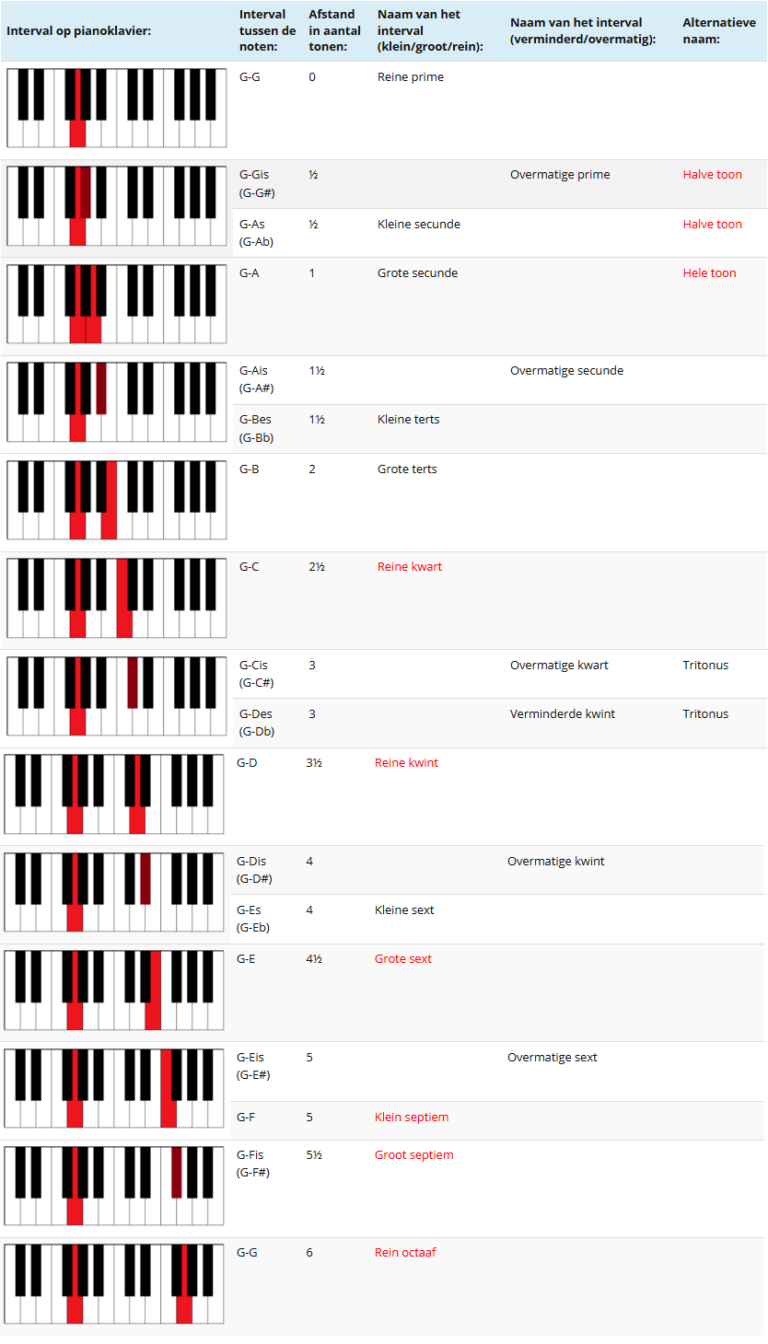 Laten we bijvoorbeeld eens kijken naar de intervallen vanaf de ‘basisnoot’ G (nomaals: als je net begint met muziektheorie, kijk dan alleen naar de belangrijkste intervallen die hieronder in het rood zijn aangegeven).